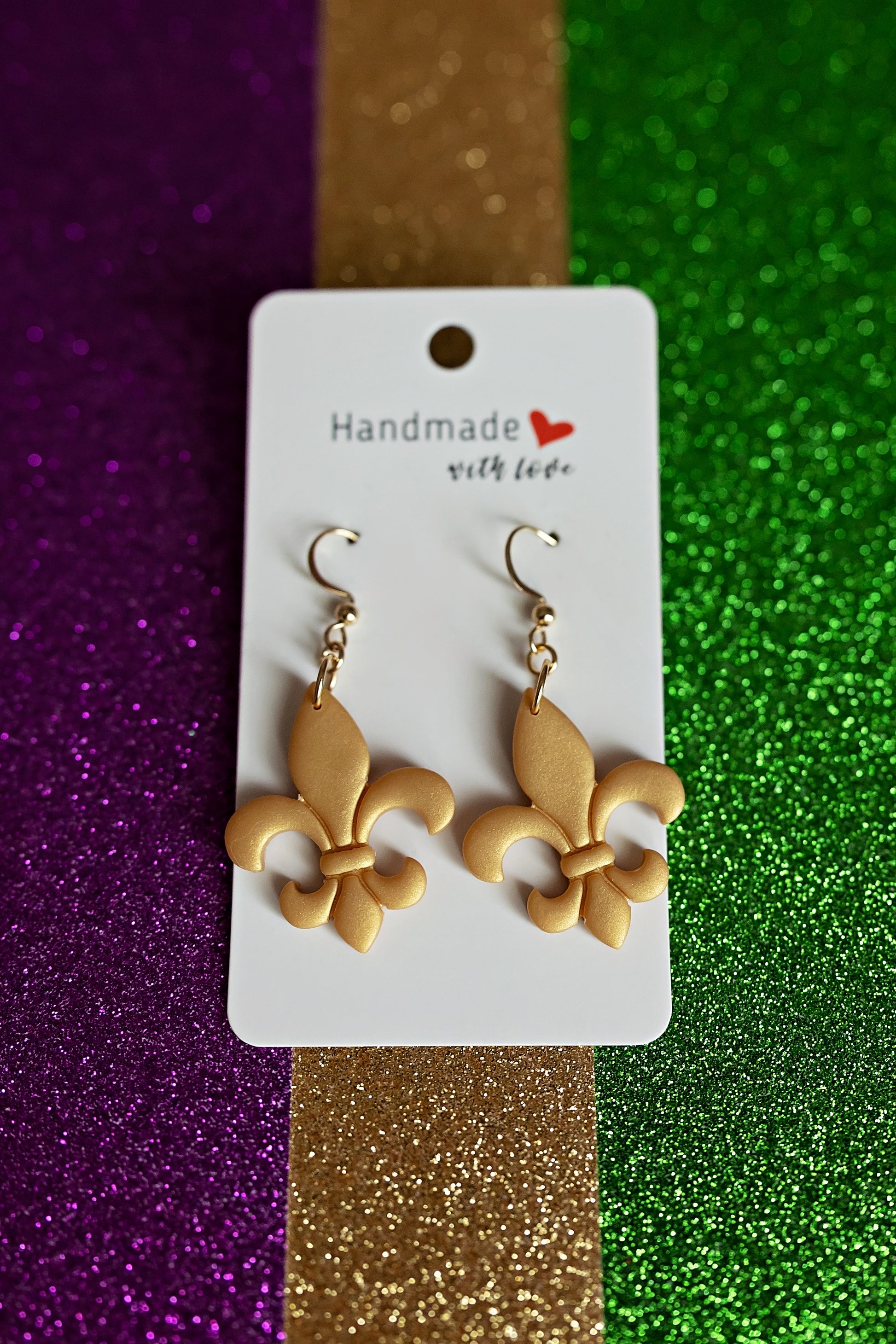 Handmade of polymer clay, and gold plated stainless steel.